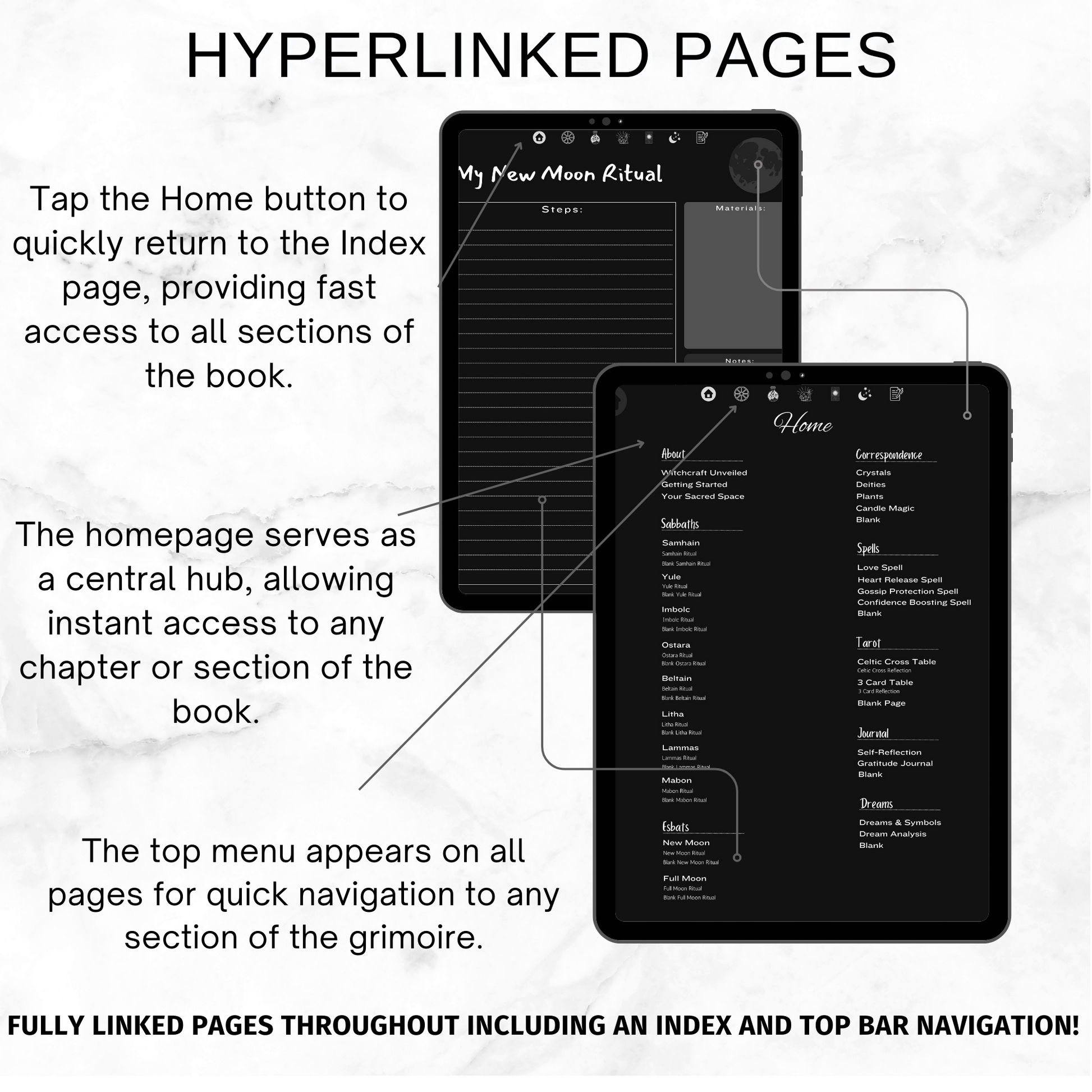 Tags: Digital Book of Shadows, Modern Witch Grimoire, GoodNotes Witchcraft, Witch Rituals Guide, Dark Mode Grimoire, Hyperlinked Spellbook, Customizable Witch Kit, Privacy Witchcraft, Spell Collection Book, Tarot Reading Journal