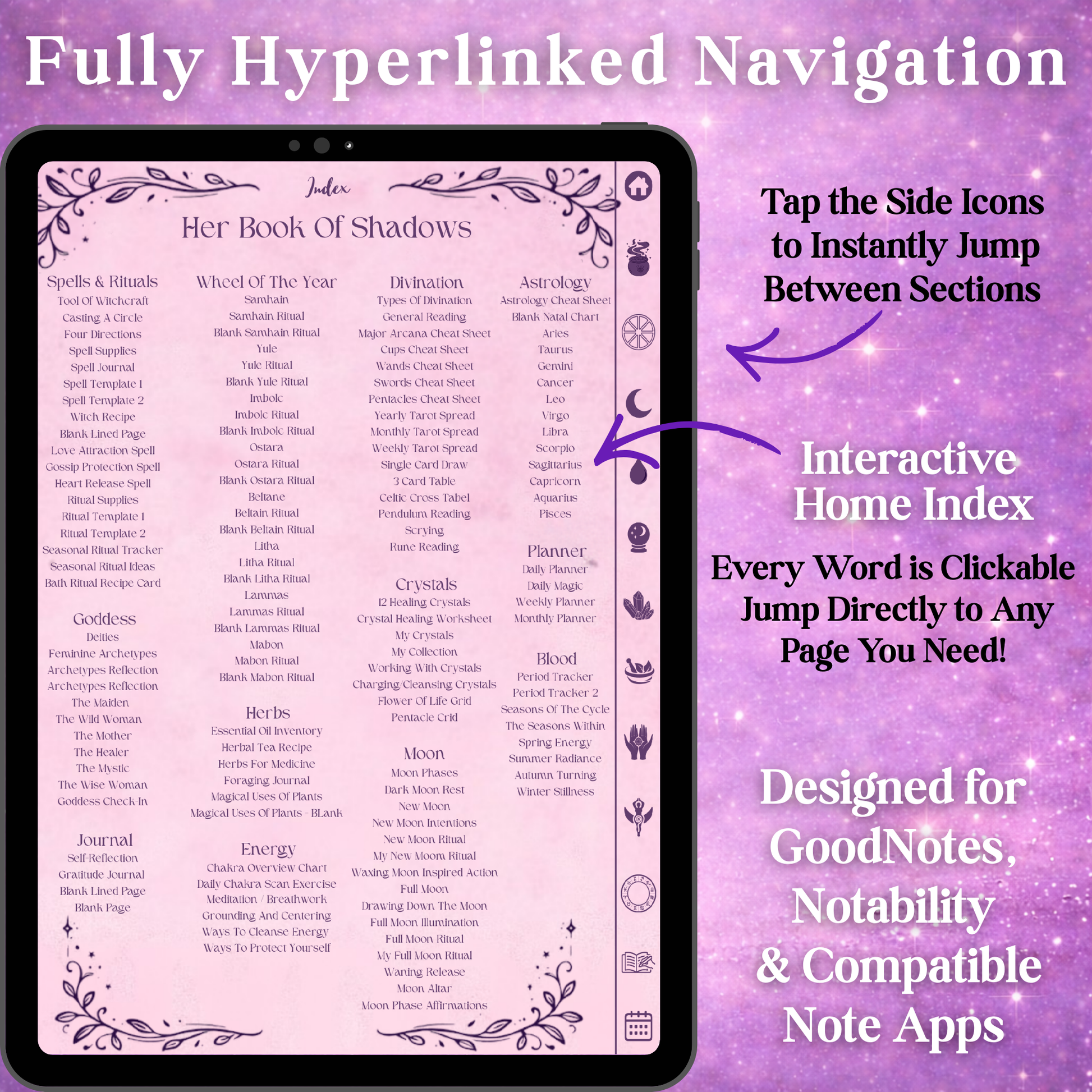 Her Book of Shadows is a hyperlinked digital PDF designed specifically for iPad and tablet use inside a compatible note-taking app.