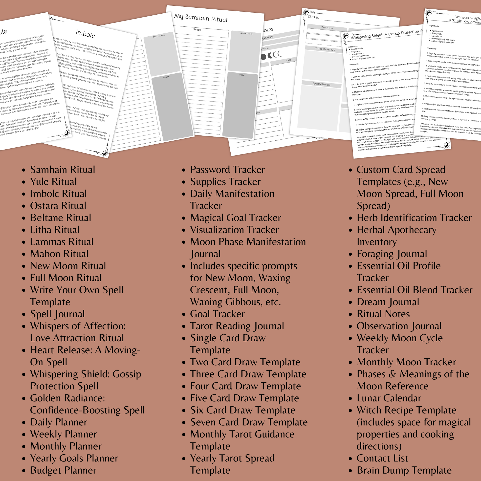 Ritual Pages: Templates for Samhain, Yule, Imbolc, Ostara, Beltane, Litha, Lammas, Mabon, New Moon, and Full Moon.