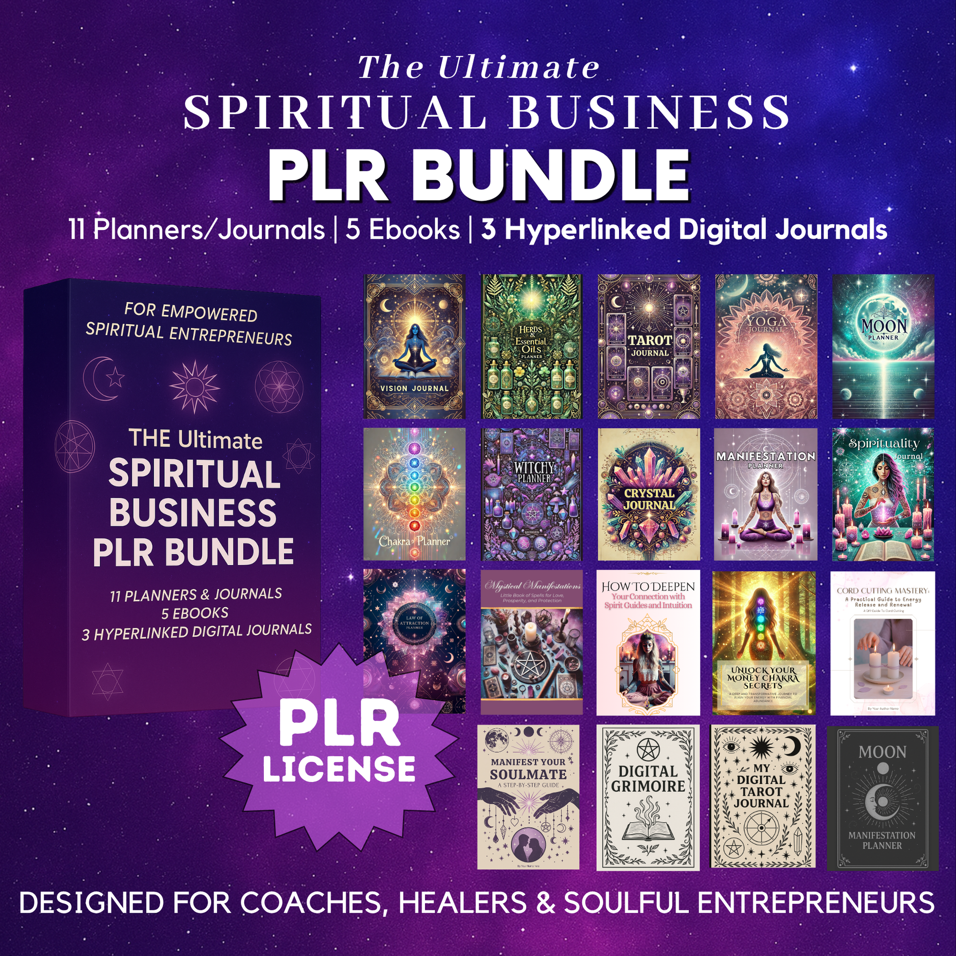 Ultimate Spiritual Business PLR Bundle – 11 Planners + 5 eBooks + 3 Hyperlinked Digital Journals | Canva Editable | GoodNotes Compatible | Instant Download